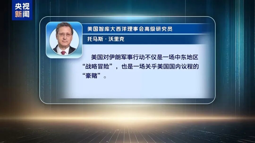 美国智库大西洋理事会高级研究员托马斯·沃里克指出:美国对伊朗军事行动不仅是一场中东地区“战略冒险”,也是一场关乎美国国内议程的“豪赌”。他说,绝大多数美国民众本期望特朗普在第二任期聚焦国内事务,尤其将精力放在经济领域,而特朗普政府事先既未寻求国会明确授权,也未争取民众广泛支持,如今只能独自承担此次行动的所有后果。