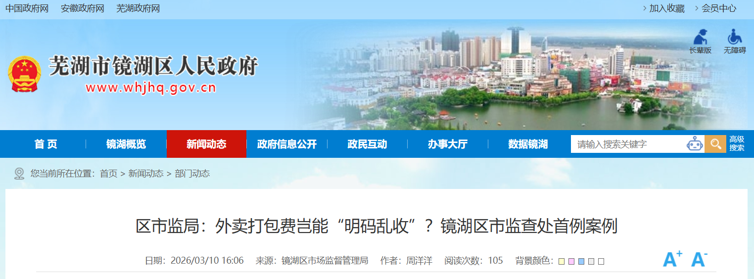 近日,据“芜湖市镜湖区人民政府”信息,镜湖区一餐饮企业因多收消费者3元外卖打包费,被市监部门处以警告和罚款1000元的处罚。原文如下: