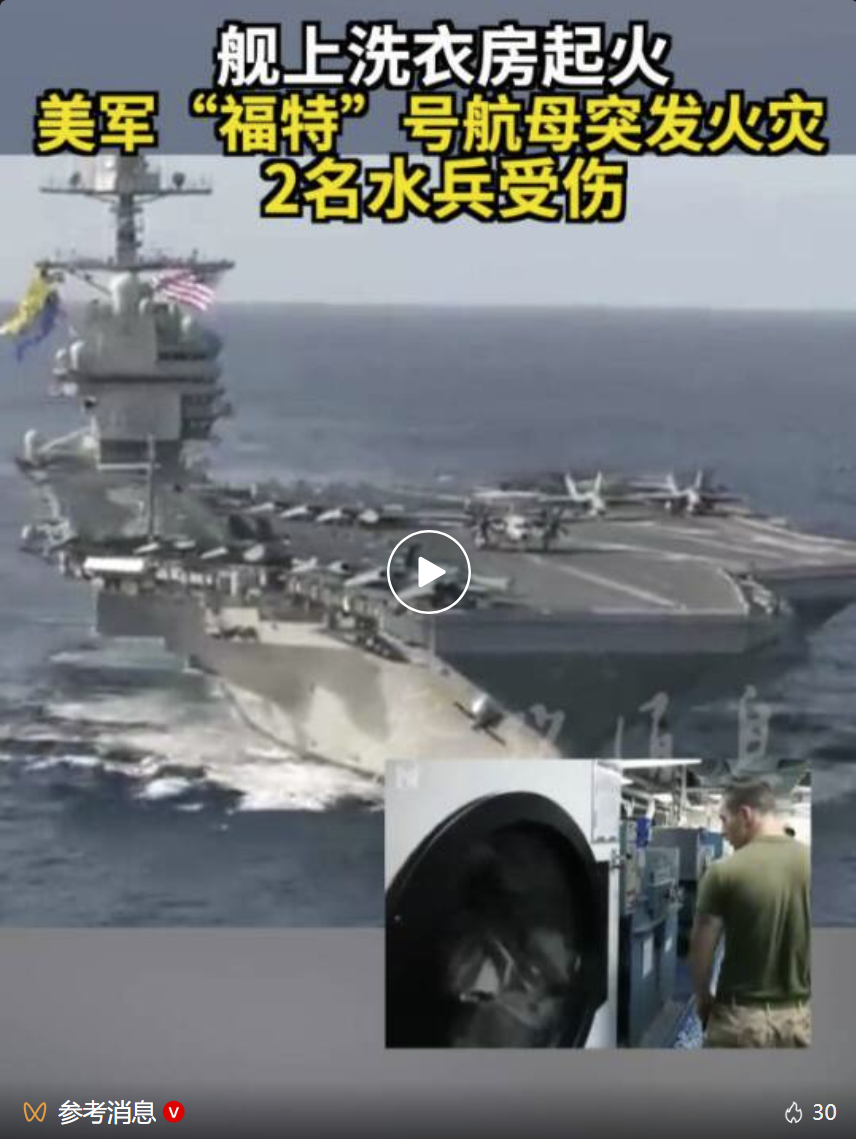 据央视新闻:美国海军中央司令部12日在社交媒体上发表声明称,“福特”号航母上的洗衣房发生火灾,起火原因与战事无关。声明称,火灾已得到控制。航母的推进装置没有受到损坏,目前仍能全面运行。两名受伤士兵正在接受治疗。“福特”号航母目前正在红海参与对伊朗的军事行动。