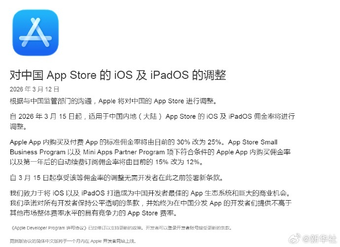 据介绍,此次佣金率调整自2026年3月15日起施行,无需开发者重新签署条款。