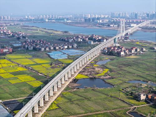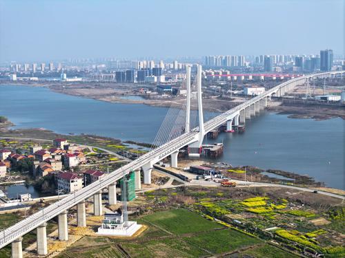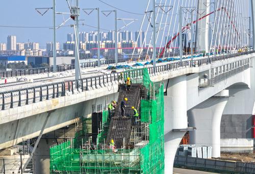 3月12日,在昌九高铁扬子洲赣江公铁大桥跨赣江南支主桥,施工人员正趁晴好天气,加紧进行桥面附属及配套设施的施工建设。目前,昌九高铁线下主体工程已全部完成,现正进行无砟轨道、铺轨、四电及其他附属配套工程施工,为下一步进入联调联试打下坚实基础。江西日报全媒体首席记者李劼 摄