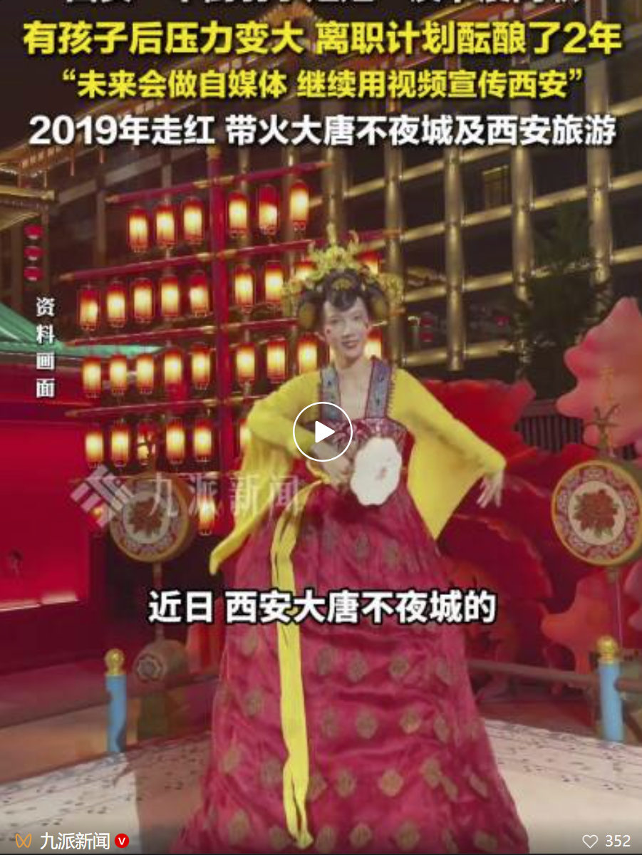 她在采访中表示:“离职计划酝酿了近两年,有孩子后生活压力变大,想摆脱约束,靠自己努力赚钱生活。接下来她会做自媒体,继续用视频宣传西安。”
