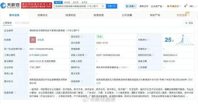 记者查询天眼查发现,西咸新区沣西新城皮卡晨策划服务部(个体工商户)成立于去年12月,经营者为冯佳晨,经营范围包括项目策划与公关服务、摄影扩印服务、文化娱乐经纪人服务、网络技术服务等。