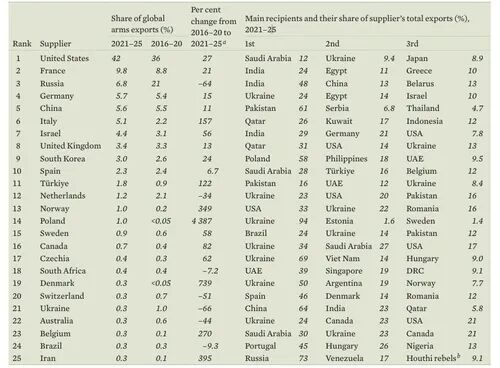 斯德哥尔摩国际和平研究所发布全球各国和地区的武器出口排行榜,韩国排名第九。《2025年国际武器转移趋势》报告截图