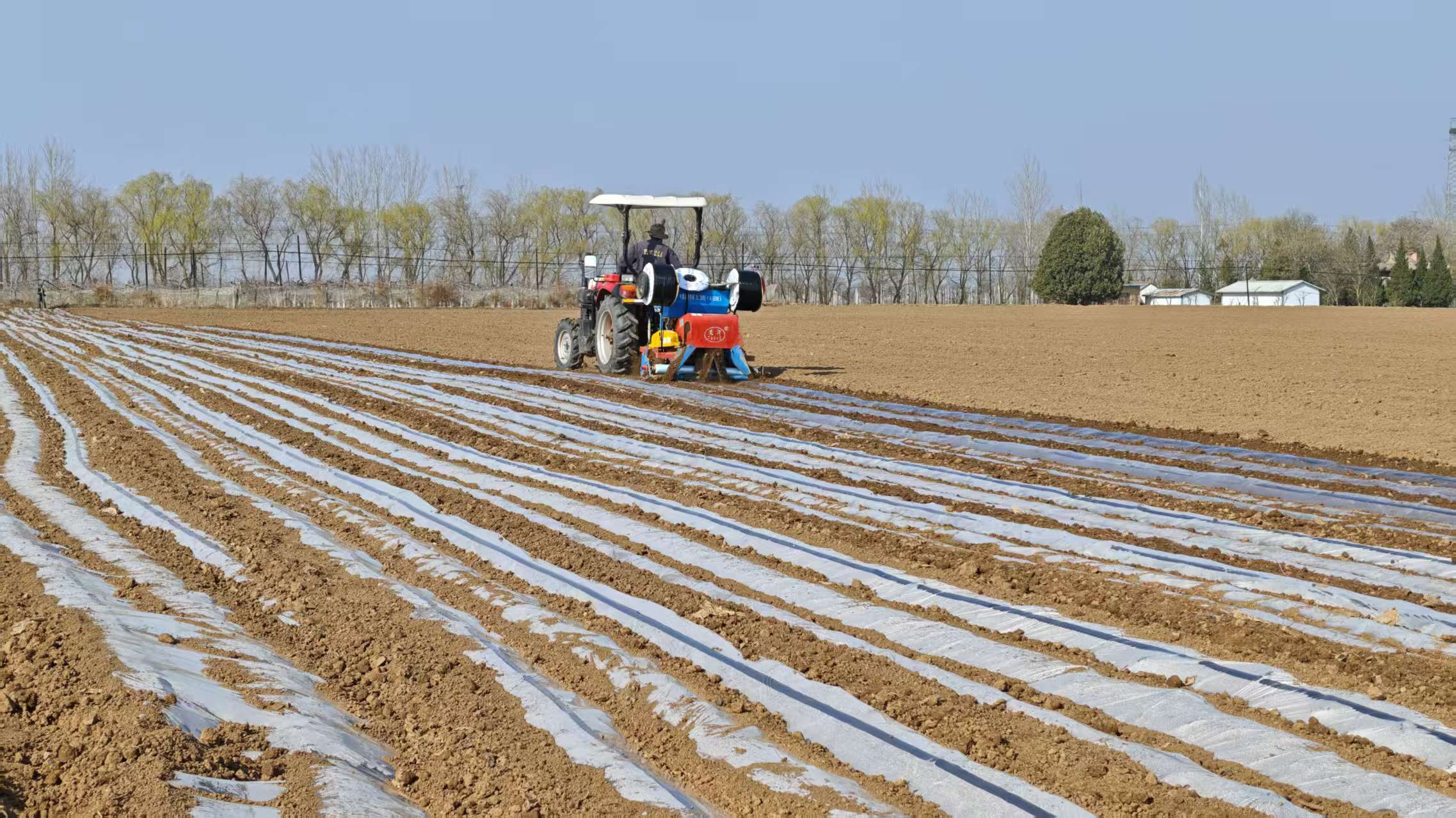 在农机高效作业的同时,务工群众也没闲着。他们手持铁锹紧跟其后,飞快地压住地膜边角,防止春风灌入。“咔嚓”的铲土声与机器的轰鸣声交织在一起,奏响了一曲春日“交响乐”。
