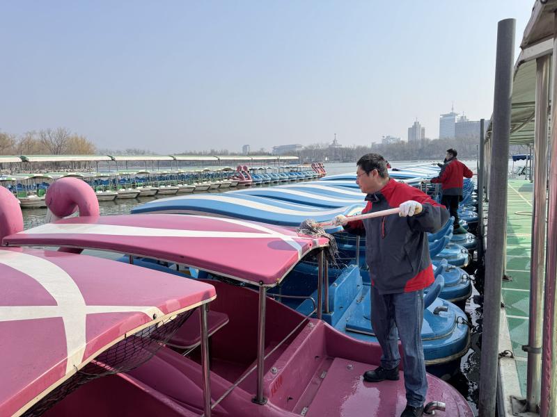 据悉,玉渊潭公园共设有4座游船码头,分别位于东湖、西湖的南北两岸,方便游客就近乘船。在开航前的准备工作中,公园工作人员对所有船只进行了擦拭保养,为电瓶充电,检查了线路开关和救生设备。目前,所有船只都通过了海事部门的检验,已具备开航条件。同时,湖面上的救援艇也已准备就绪,码头售票窗口备足了现金,确保乘客既可以扫码购票,也可以使用现金支付。