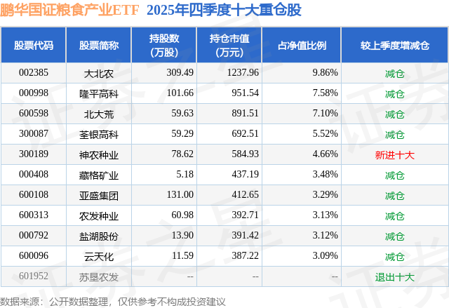 鹏华国证粮食产业ETF的前十大重仓股如下: