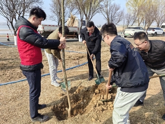 此次植树活动共有21家单位、500余名人参与,活动现场热火朝天。大家分工协作、默契配合,有人挥锹挖穴、有人扶苗正干、有人填土夯实、有人围堰浇水,一派繁忙。新栽的树苗迎风挺立,为春日的黄河增添勃勃生机。