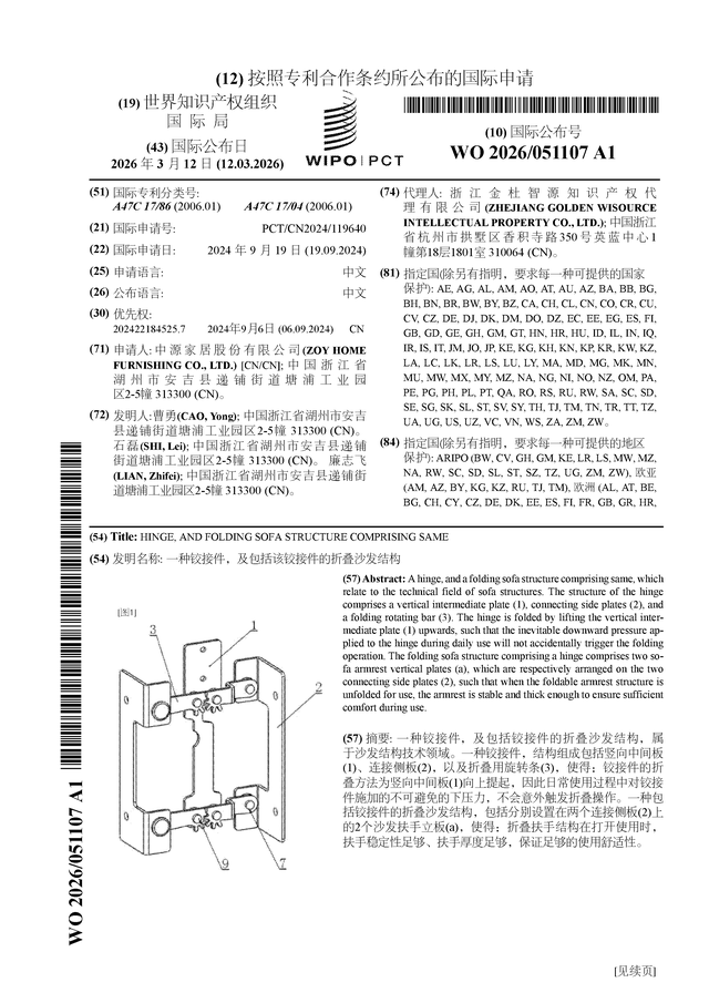 证券之星消息,根据企查查数据显示中源家居(603709)公布了一项国际专利申请,专利名为“一种铰接件,及包括该铰接件的折叠沙发结构”,专利申请号为PCT/CN2024/119640,国际公布日为2026年3月12日。