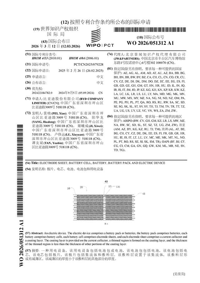 证券之星消息,根据企查查数据显示比亚迪(002594)公布了一项国际专利申请,专利名为“极片、电芯、电池、电池包和用电设备”,专利申请号为PCT/CN2025/079228,国际公布日为2026年3月12日。