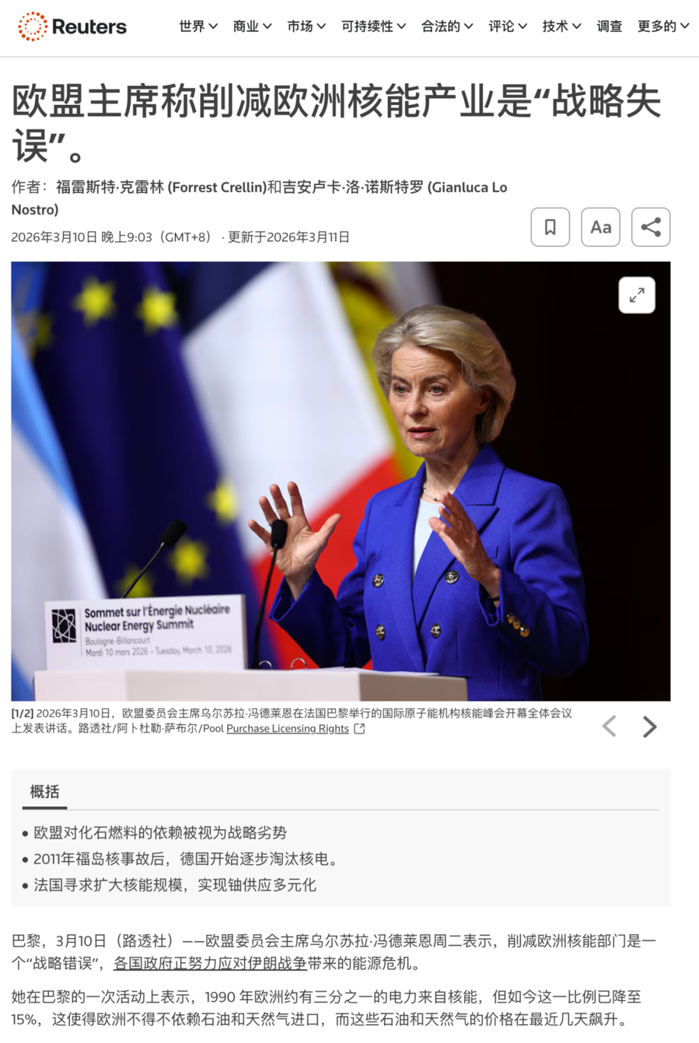 就在同一天、在同一个会上,欧盟委员会主席冯德莱恩表示,欧洲主动降低核能占比,是一个“战略性错误”。