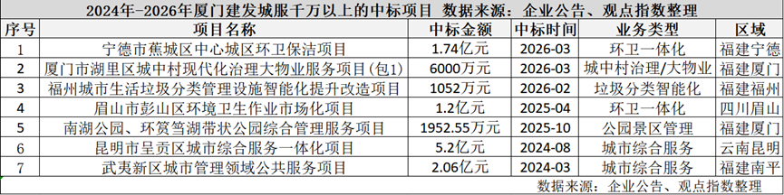 三天后,宁德市蕉城区中心城区环卫保洁项目的结果公告公布,厦门建发城服再次出现在中标名单中。