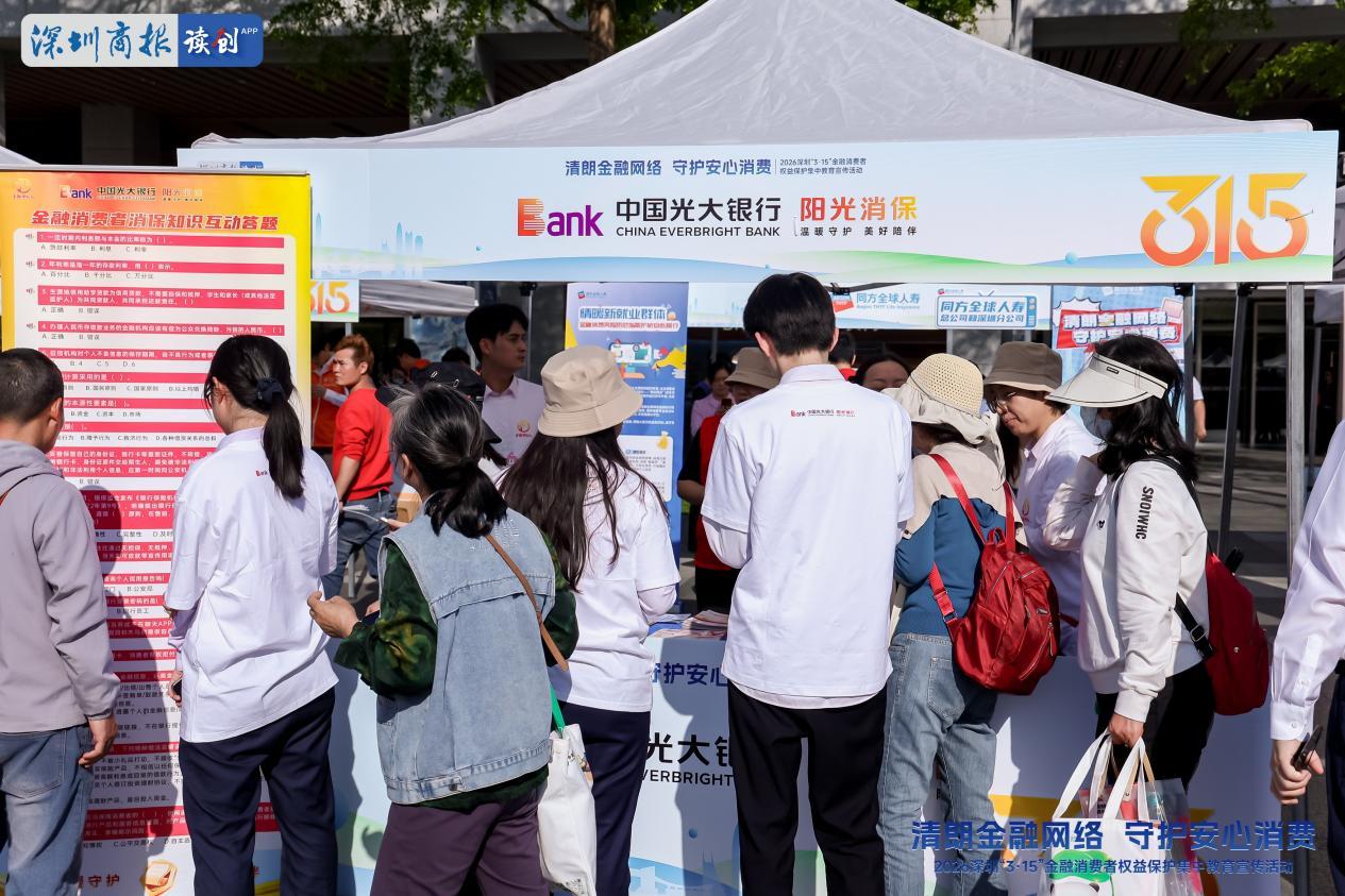 在一年一度的“3•15”国际消费者权益日来临之际,3月13日,一场别开生面的2026年深圳“3・15”金融消费者权益保护集中教育宣传活动在深圳中心书城北一楼户外广场举行。光大银行深圳分行作为参与的重要金融力量,通过宣读“315诚信宣言”、举办“金融消保市集”活动等形式,展示了其践行消保责任、服务市民群众的担当与作为。