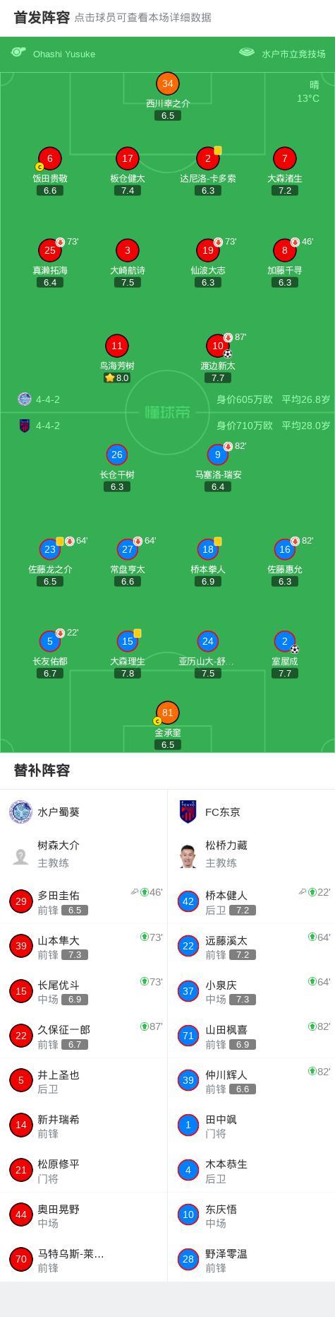 第61分钟,多田圭佑助攻,渡边新太推射扳平比分,水户蜀葵1-1