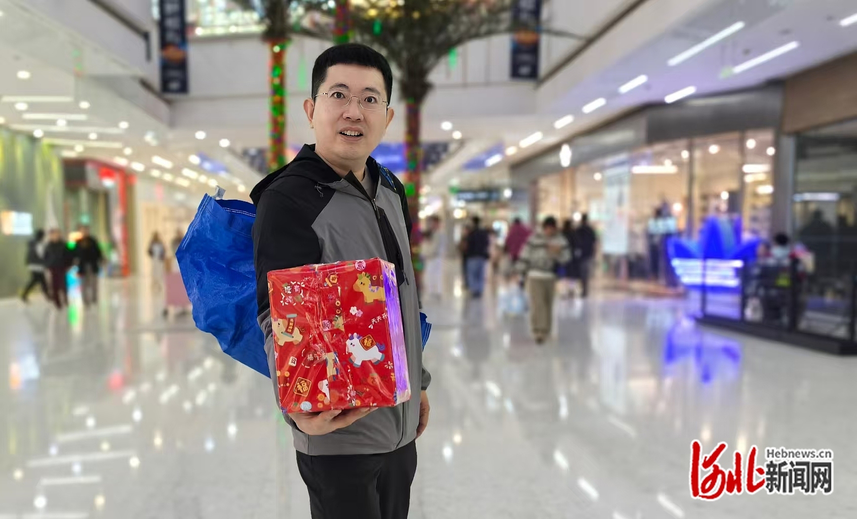 3 月13日下午四点,记者在石家庄勒泰中心见到了正在拍摄短视频的李念和其助理。两人各拎着两大袋沉甸甸的蓝色编织袋,里面装满包装整齐、品类多样的“神秘礼物”。在熙攘人群中,他俩格外显眼。