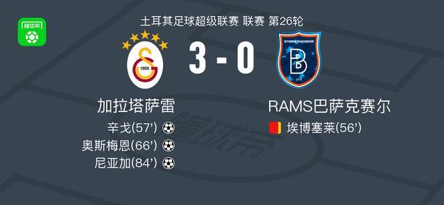 北京时间3月15日土耳其足球超级联赛 联赛 第26轮,加拉塔萨雷主场对阵RAMS巴萨克赛尔。加拉塔萨雷辛戈破门,奥斯梅恩破门,尼亚加破门。最终比分加拉塔萨雷 3-0 RAMS巴萨克赛尔。