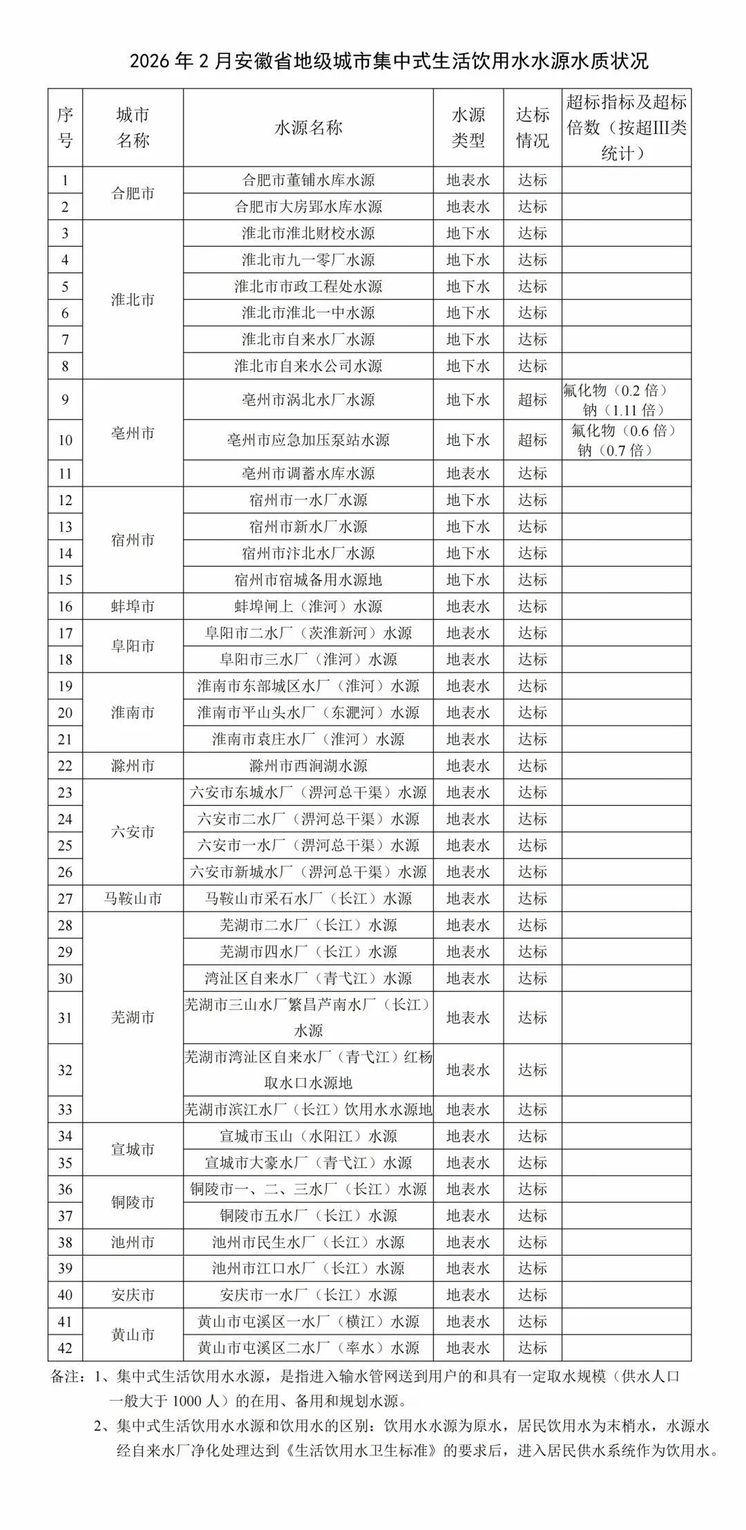 2026年2月,全省地级城市集中式生活饮用水水源取水总量为18491.3万吨,达标水量18413.2万吨,达标率99.6%。亳州市2个地下水源地受地质原因影响氟化物和钠出现超标,最高超标倍数分别为0.6倍和1.11倍。