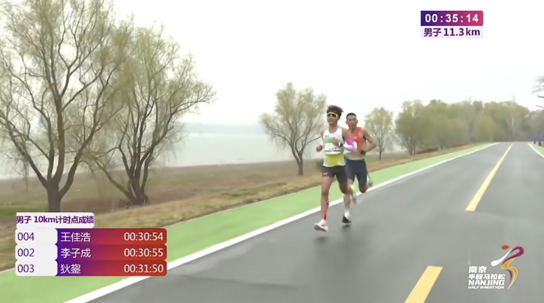 5-10公里,王佳浩和李子成继续轮流领跑,10公里处,王佳浩成绩是30分54秒,李子成成绩是30分54秒,狄鋆成绩是31分50秒。