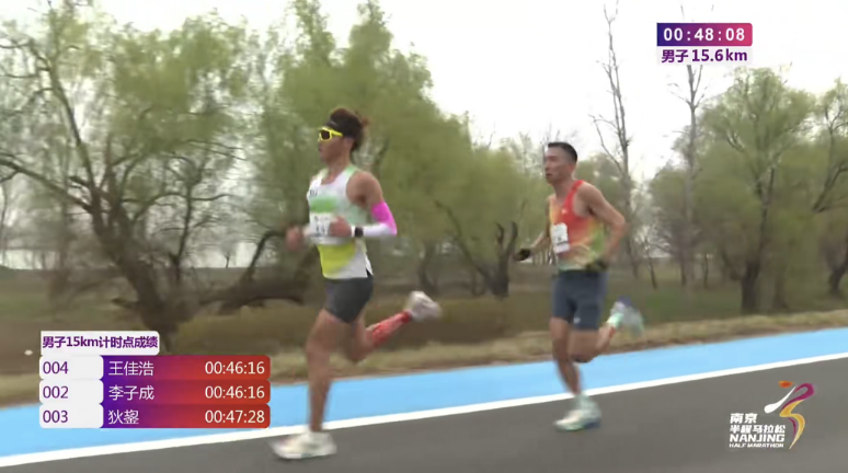 15公里处,王佳浩和李子成的成绩都是46分16秒,狄鋆成绩是47分28秒。