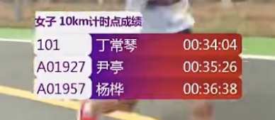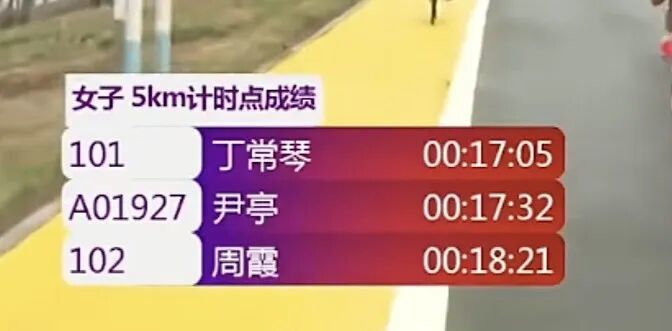 女子方面,丁常琴一直处于领先位置。第5公里,丁常琴用时17分05秒。第10公里,丁常琴用时34分04秒。