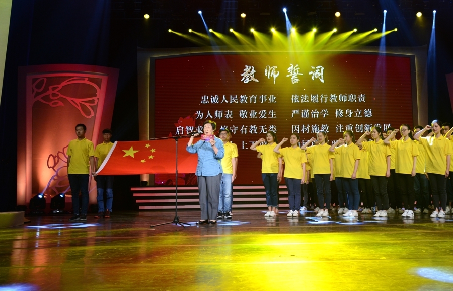 在2018年9月8日举行的上海市第34个教师节主题活动现场,“上海市教育事业杰出贡献奖”获得者于漪老师带领新入职教师代表庄严宣誓。(摄影:李立基)