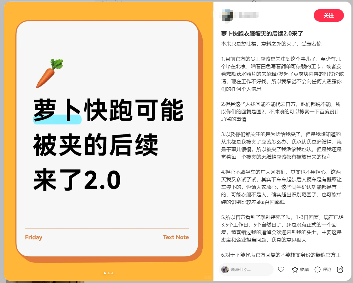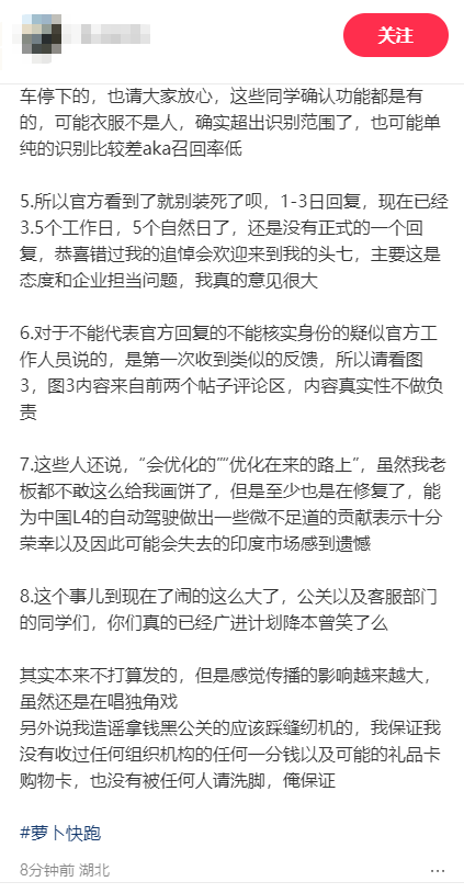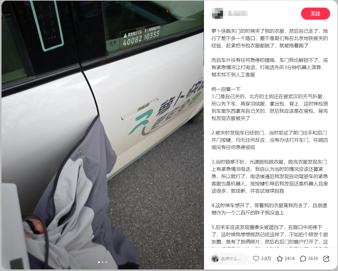 乘客在首篇贴文中详细还原了事发全过程:事发时其下车过程中衣服被萝卜快跑车门夹住。车内外均无法解锁开门,且车辆外部未设置紧急停车按钮,乘客无法自主触发停车。车辆随后启动,乘客带着被夹的衣服被拉至下一个路口。所幸乘客反应迅速,及时脱衣自救,车辆也因摄像头被衣服遮挡而被迫停下,才未造成人身伤害。