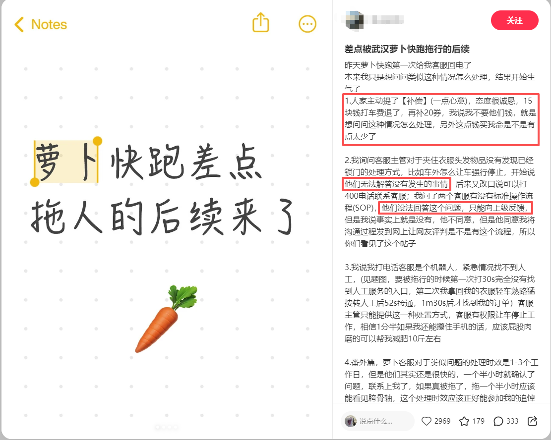 随后乘客发布第二篇贴文,披露了事件的后续处理情况:萝卜快跑客服致电乘客,提出退还15元车费并补偿20元优惠券的解决方案。该方案被乘客明确拒绝,并提出核心诉求,希望企业明确车门夹物锁门的应急处理标准流程、正视安全漏洞并完善应急预案。