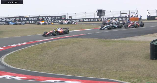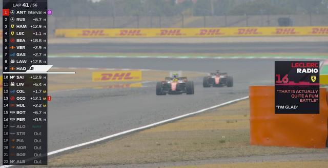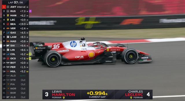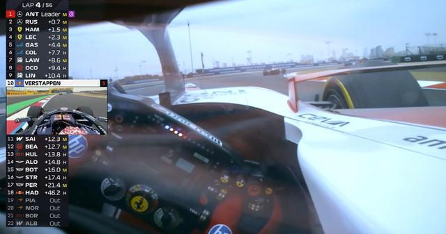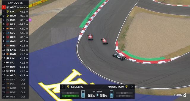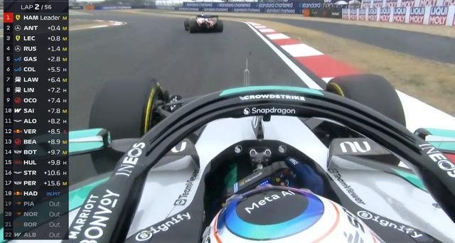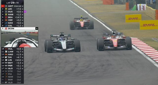 两台法拉利展开内斗,拉塞尔随后在十四号弯超过汉密尔顿来到第三