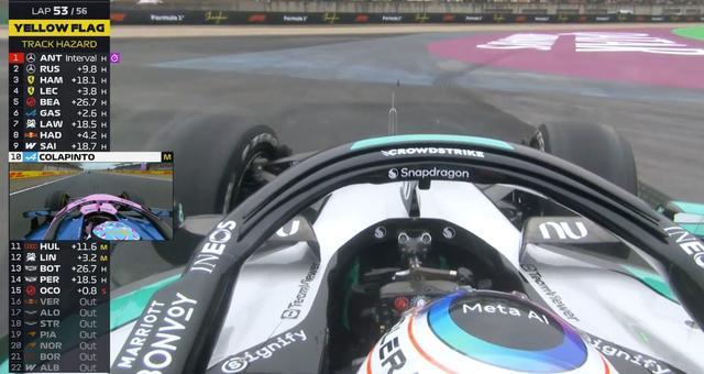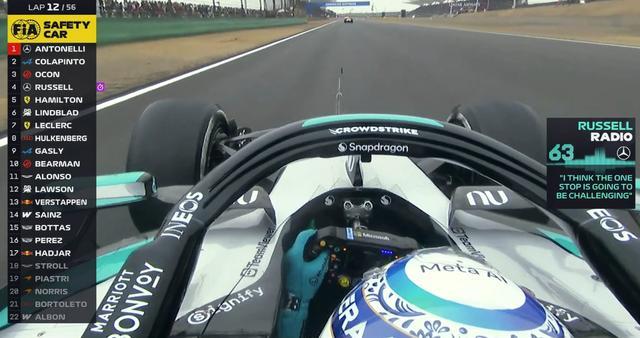 赛会出动了安全车,拉塞尔在tr中表示一停策略很有挑战