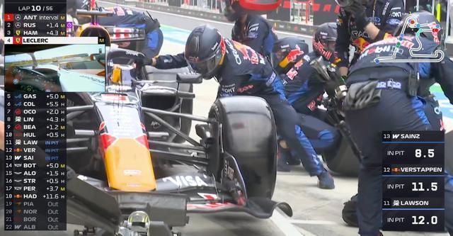 维斯塔潘向车队报告他的软胎已经不行了,他在第十圈进站