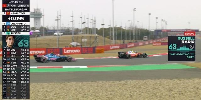 第十五圈:汉密尔顿超越科拉平托上到第二,拉塞尔报告他的新硬胎没有抓地力