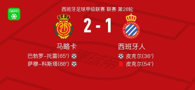 北京时间3月15日西班牙足球甲级联赛 联赛 第28轮,马略卡主场对阵西班牙人。马略卡巴勃罗-托雷破门,萨穆-科斯塔破门。西班牙人皮克尔破门。最终比分马略卡 2-1 西班牙人。