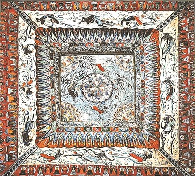 围绕着莲花的是四身执花飞天,在蓝天的映衬下,长巾飘举,遨游曼舞,周围浮云流动,似有风在吹拂。井心以外有卷草纹、联珠纹、垂角纹、帷幄等,颜色有淡红、深红、赭石、黄、白、绿、黑等,色彩丰富并且描绘细致。最外层是一组伎乐飞天,他们手握琵琶、箜篌、腰鼓等,淡黄的底色,与内层的蓝色相呼应,气氛热烈欢快。