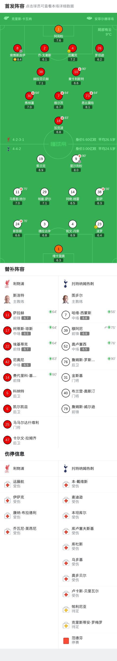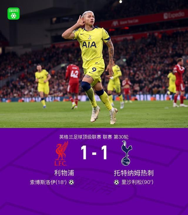 北京时间3月16日英格兰足球顶级联赛第30轮,利物浦主场对阵托特纳姆热刺。上半场,索博斯洛伊直接任意球破门,加克波远射被扑后中柱;下半场,里沙利松在干扰下射门被扑,穆阿尼助攻里沙利松绝平。最终比分利物浦 1-1 热刺。