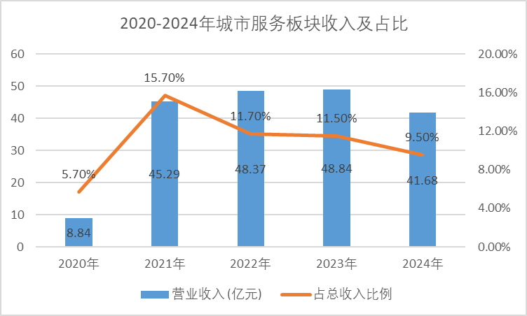 2020年至2024年,碧桂园服务城市服务板块分别录得营业收入8.84亿元、45.29亿元、48.37亿元、48.84亿元、41.68亿元,增幅分别为1192.5%、416%、6.8%、0.97%、-14.7%。