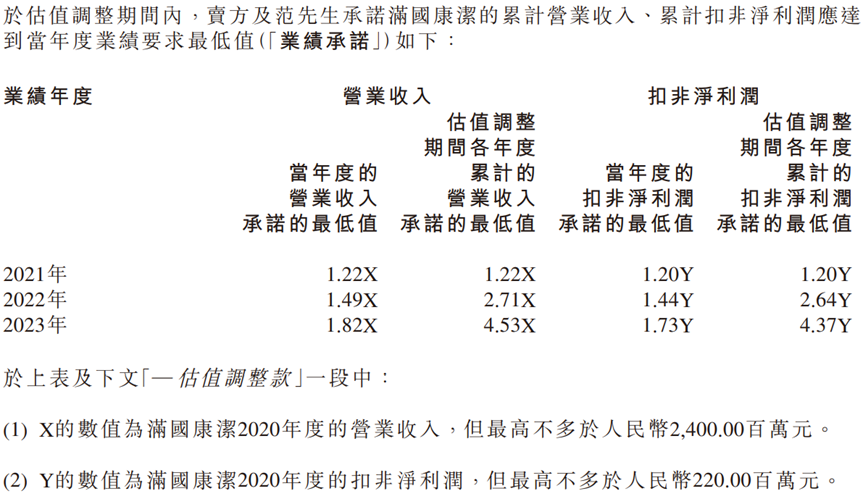 达成收购之时,满国康洁对碧桂园服务作出业绩承诺,分别在2021年、2022年、2023年实现营业收入不低于29.28亿元、35.76亿元、43.68亿元,扣非净利润不低于2.64亿元、3.17亿元、3.01亿元。