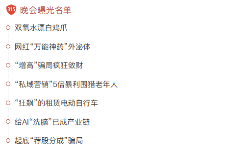 今年央视315晚会曝光了以下内容,为大家盘点出来: