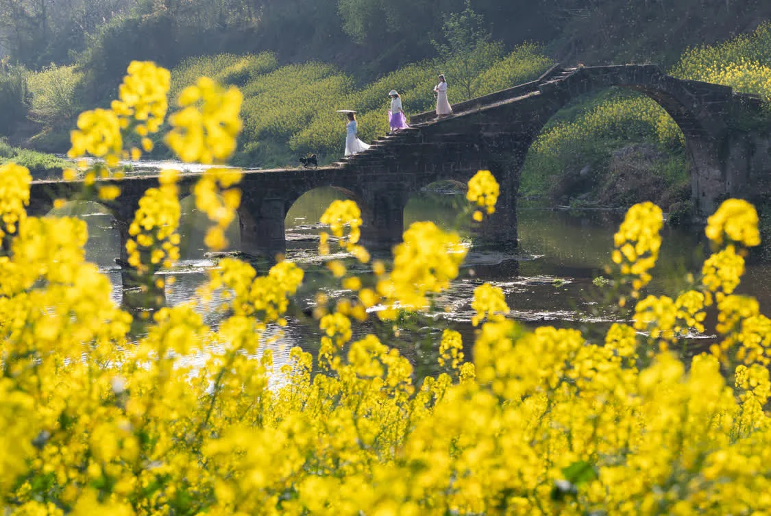 在四川省乐山市井研县王村镇,几名游客走上梳金滩石桥,小河、石桥与油菜花相映成趣(3月5日摄,无人机照片)。 新华社发(陈大康摄)