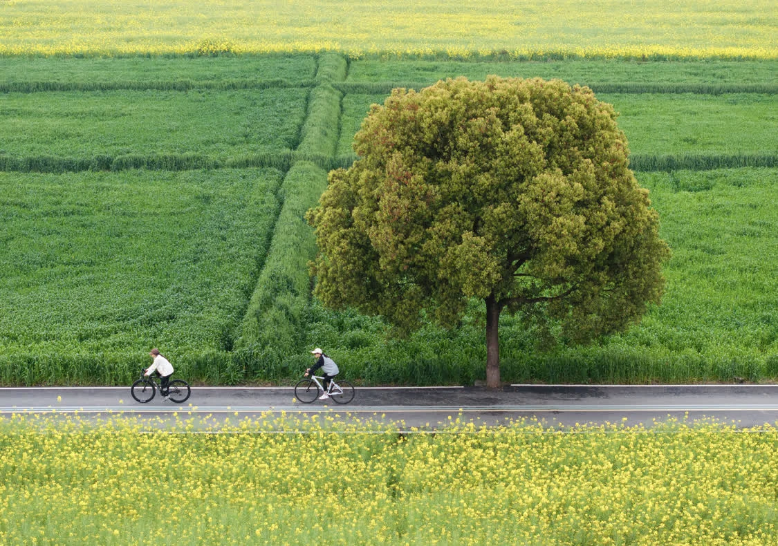 两名游客骑行在四川省峨眉山市九里镇汪家村的油菜花田旁(3月6日摄,无人机照片)。新华社记者 江宏景 摄