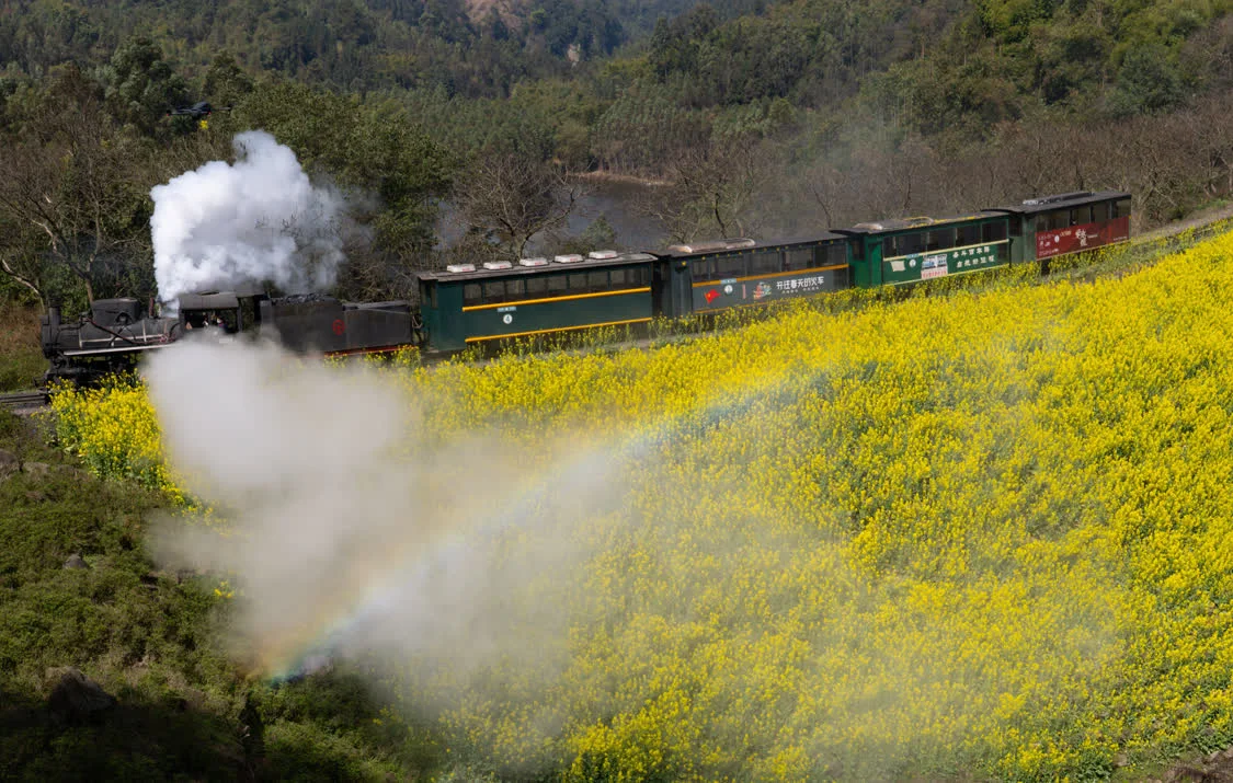 在四川省乐山市犍为县芭沟镇,小火车行驶在油菜花田中(3月4日摄)。 新华社发(陈大康摄)