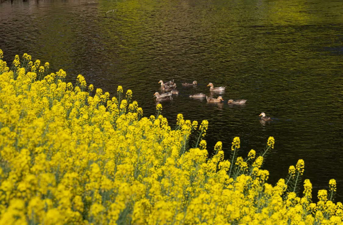 在四川省峨眉山市符溪镇,一群鸭子在峨眉河中游动觅食,岸边是金黄的油菜花(3月4日摄)。新华社记者 江宏景 摄