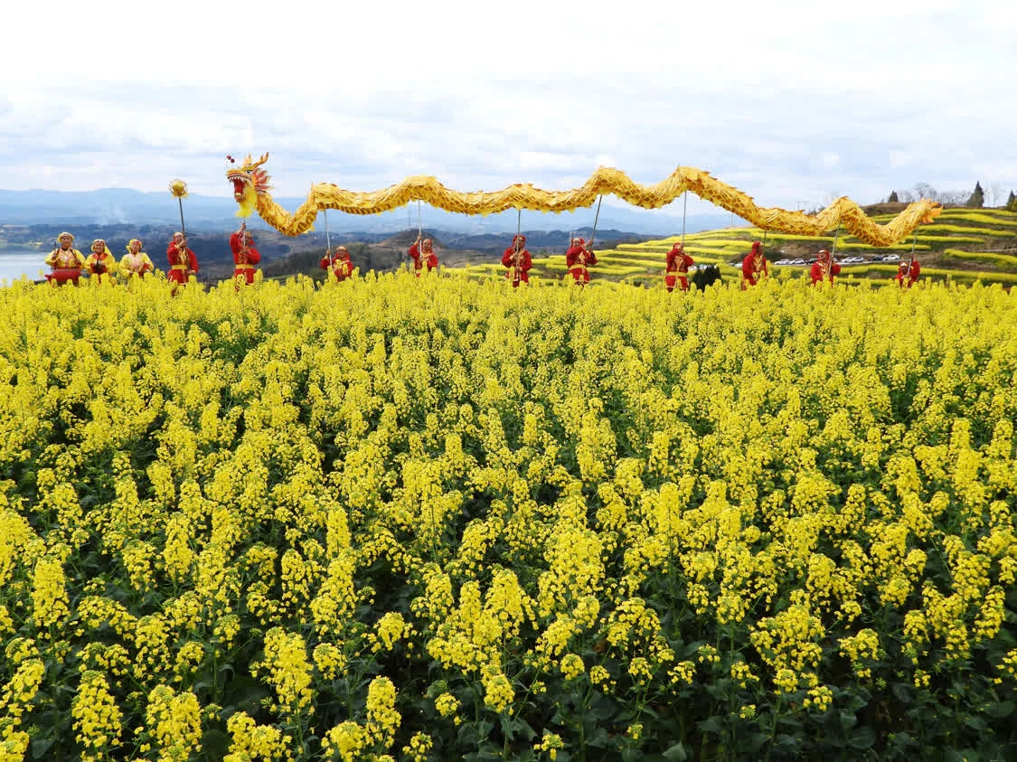 四川省达州市达川区龙会乡张家山村在油菜花田间举办舞龙活动(3月2日摄)。 新华社发(邓良奎摄)