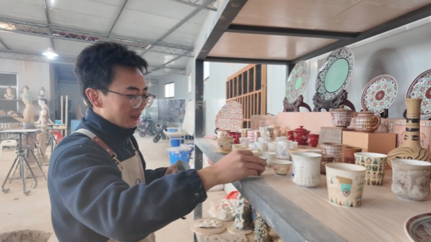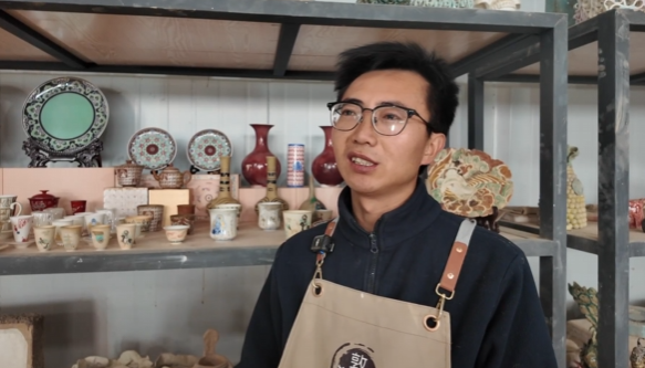 敦煌文创产品策划运营师王彦军说:“敦煌作为一个旅游城市,对文创产品这一块,我发现需求量还是相当大的。所以我就结合了我的所学、我的专业,把敦煌元素转换成文创产品,嫁接于陶瓷之上,研发了一系列敦煌元素的陶瓷产品。比如有咖啡杯、茶具以及日常用瓷、艺术用瓷等。”