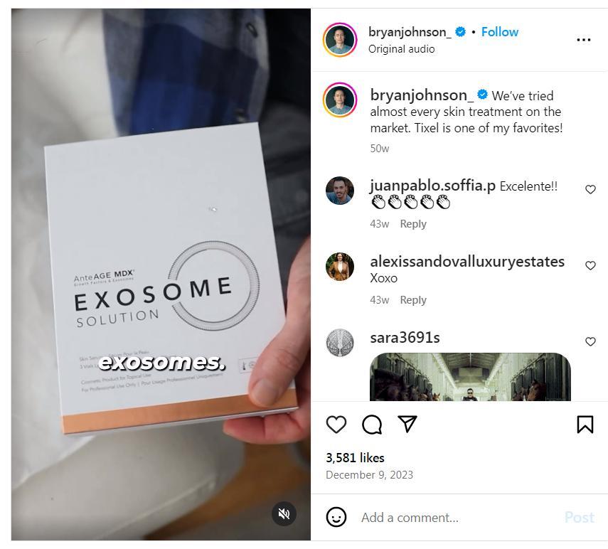 当然,抗衰网红/换血富豪布莱恩·约翰逊(Bryan Johnson)也没错过这个潮流。他把外泌体用来快速镇定皮肤以及防止秃头。