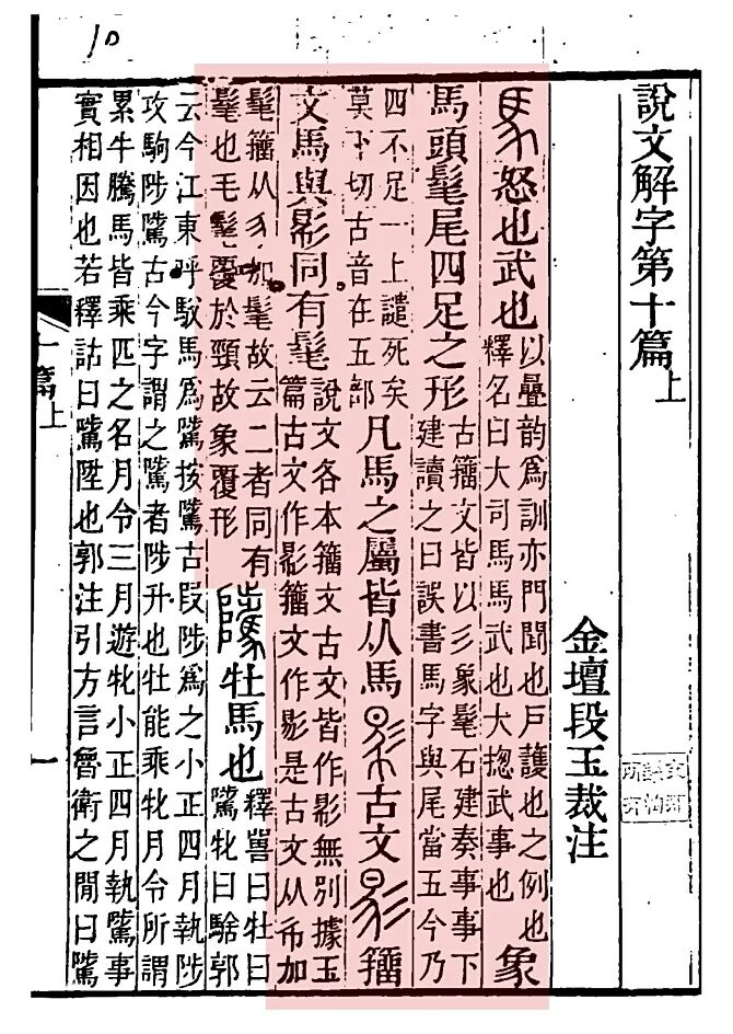 东汉许慎《说文解字》对“马”字的解说形象而深刻:“马,怒也,武也。象马头鬃尾四足之形。”书中《马部》收录115字,在表示家畜的部首中收字最多,反映了马在古代社会生活中的重要地位