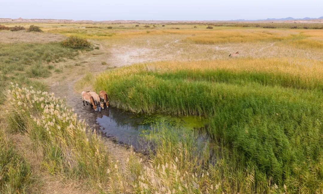 曾经因过度猎捕、栖息地遭受破坏,以及气候变化,普氏野马的野生种群在20世纪70年代于其原生地被宣告灭绝。1985年,我国启动“野马返乡计划”,从国外引进野马,并在新疆和甘肃分别设立放归基地,逐步恢复和重建普氏野马野生种群。甘肃敦煌西湖国家级自然保护区先后在2010年和2012年共放归了28匹野马,经过十多年的自然繁育,截至2025年,敦煌西湖保护区的普氏野马野外种群数量已突破200匹,野生种群重建工作成效显著。这场跨越山河的物种复苏,重建的不仅是一个珍稀物种的野外家园,更铺展成一幅恢弘壮阔的生命归乡画卷。