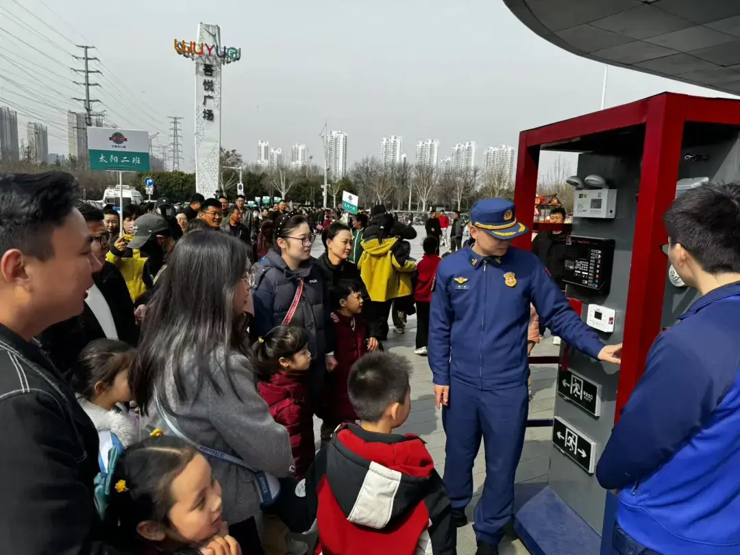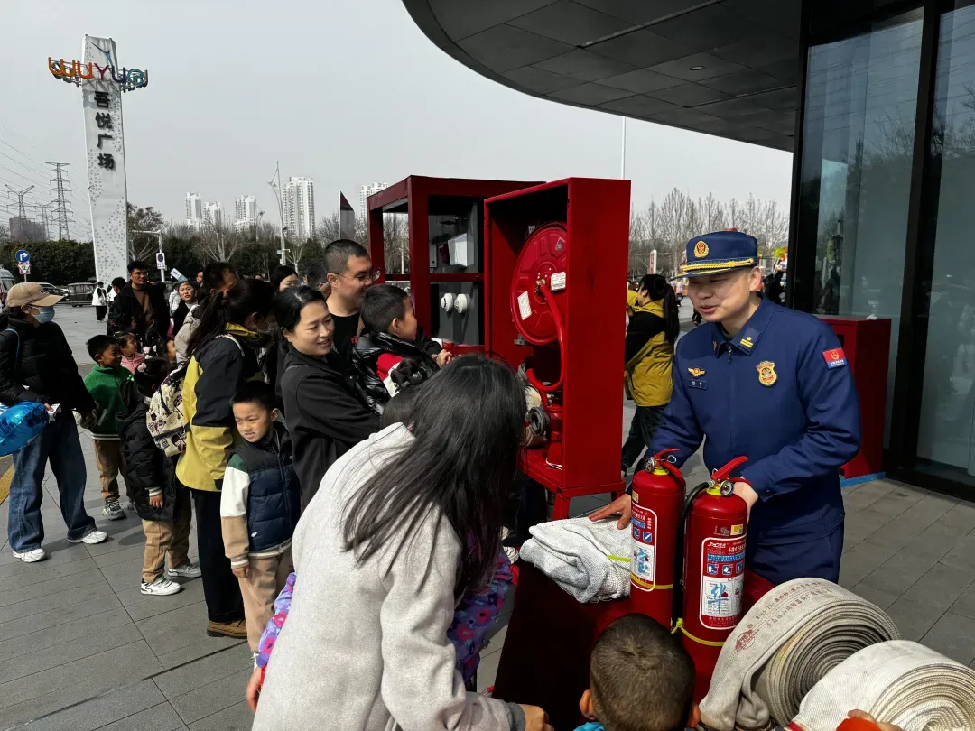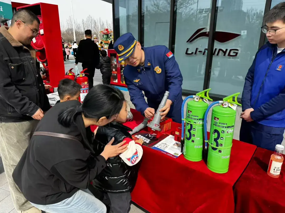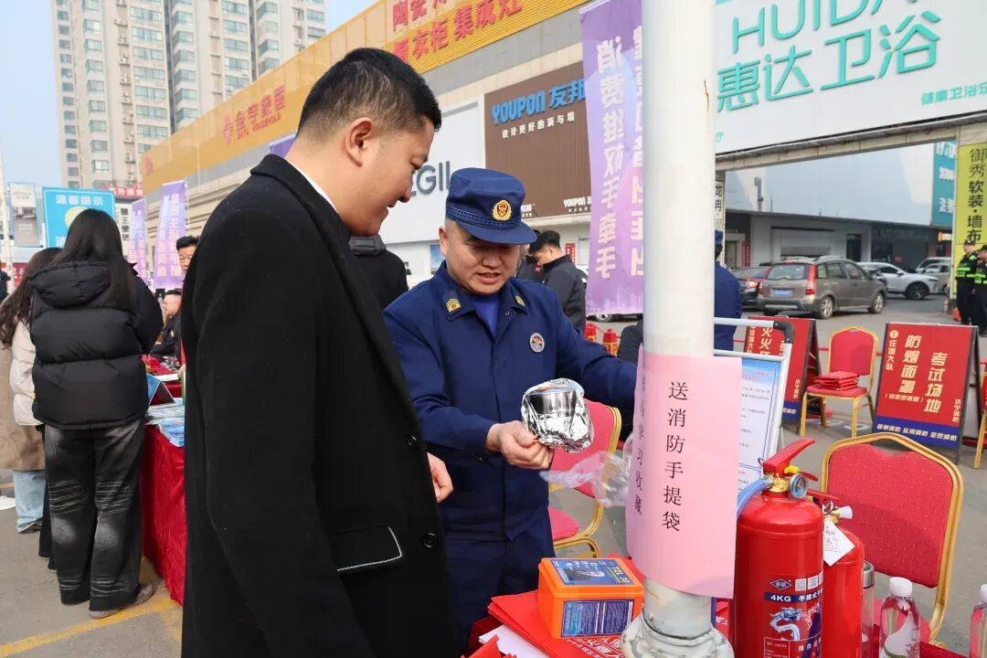 济宁北湖消防大队在辖区广场、商超等人流密集区域设立消防产品宣传咨询台,通过展示灭火器、应急照明灯、疏散指示标志、消防水带、过滤式自救呼吸器等常用消防产品,吸引过往群众驻足咨询。