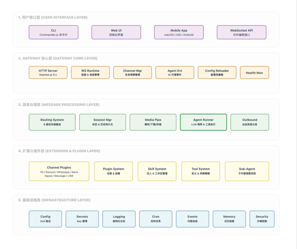 提供CLI、Web UI、移动App、WebSocket API等入口,把用户操作转成统一的内部请求。