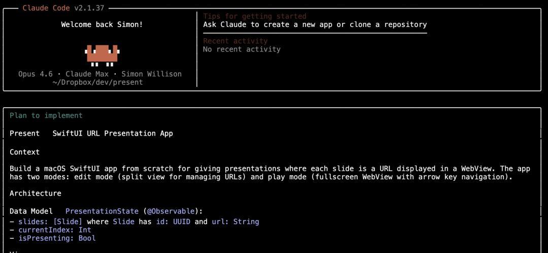 Simon Willison花40分钟用Claude Codevibe coding了一个SwiftUI幻灯片App,全程不看代码。