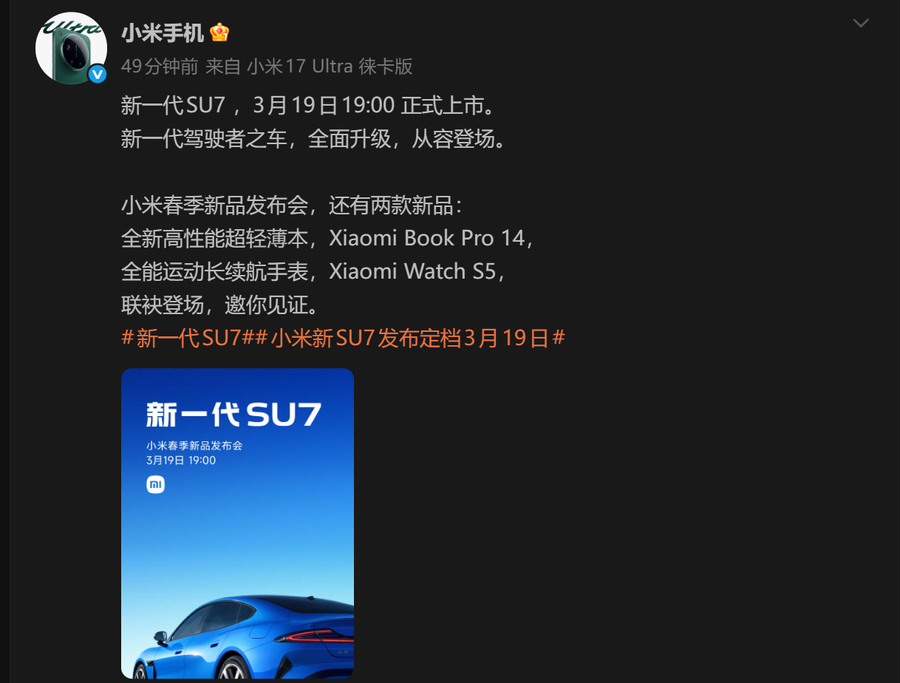 时隔三年多,小米笔记本Pro终于迎来更新,今日已正式定档,将于3月19日和新一代小米SU7一起发布,并且直接在19:00上市。小米笔记本Pro 14作为小米笔记本时隔三年多的首次全面升级,在设计和性能上都带来了显著提升,成为本次发布会的另一大亮点。
